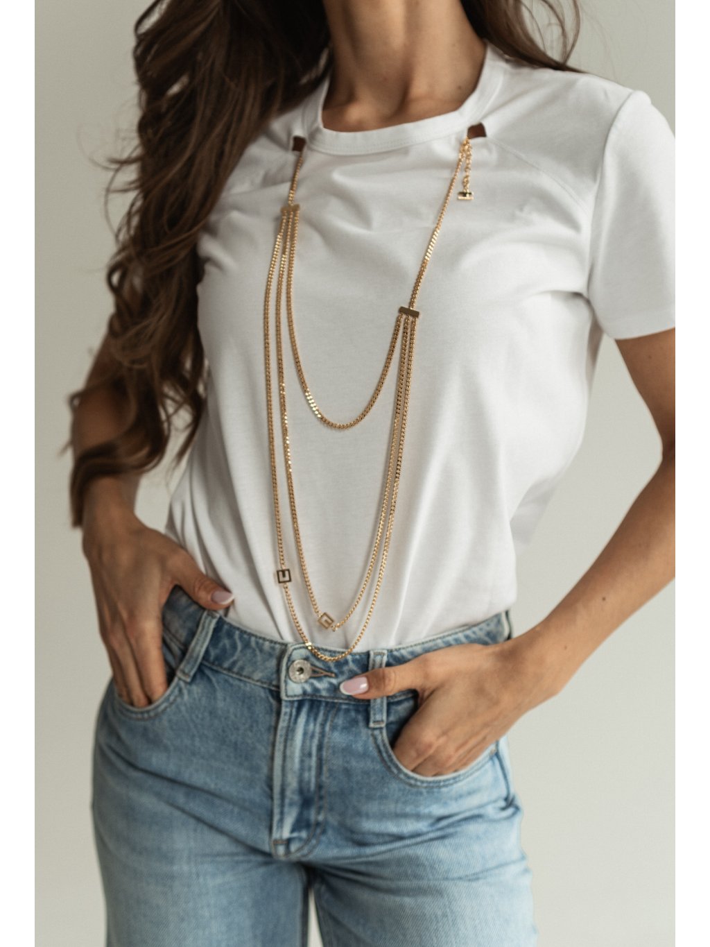 Jednoduchosť, ktorá zaujme. Toto biele tričko Elisabetta Franchi zdobia elegantné zlaté retiazky pri výstrihu, ktoré mu dodávajú luxusný a ženský nádych. Kvalitný materiál a precízny strih zaručujú maximálne pohodlie, zatiaľ čo zlaté akcenty robia z tohto trička výnimočný kúsok pre každodenné aj elegantné stylingy. Dokonale sa kombinuje so sakom, džínsami či sukňou.🤍