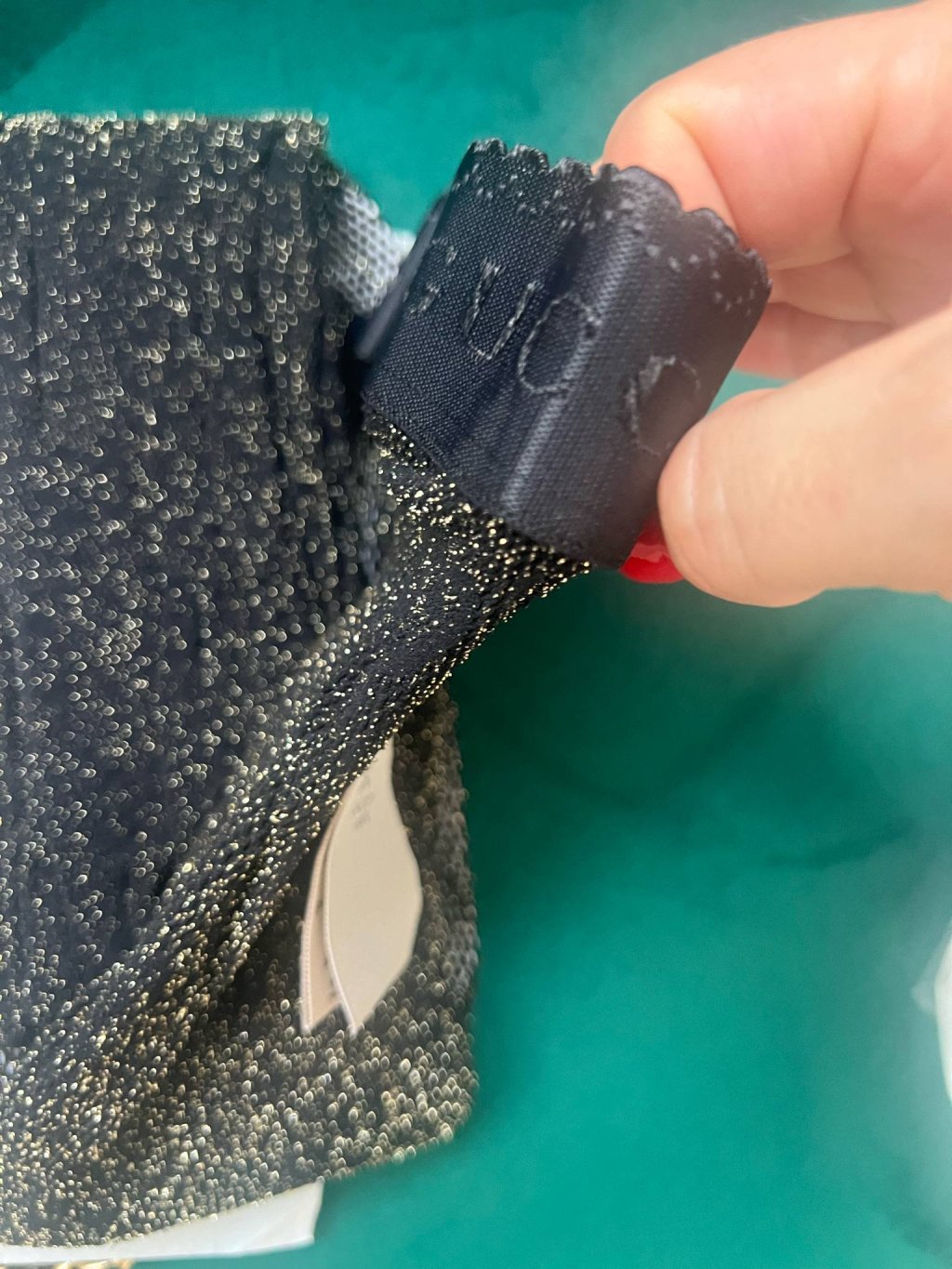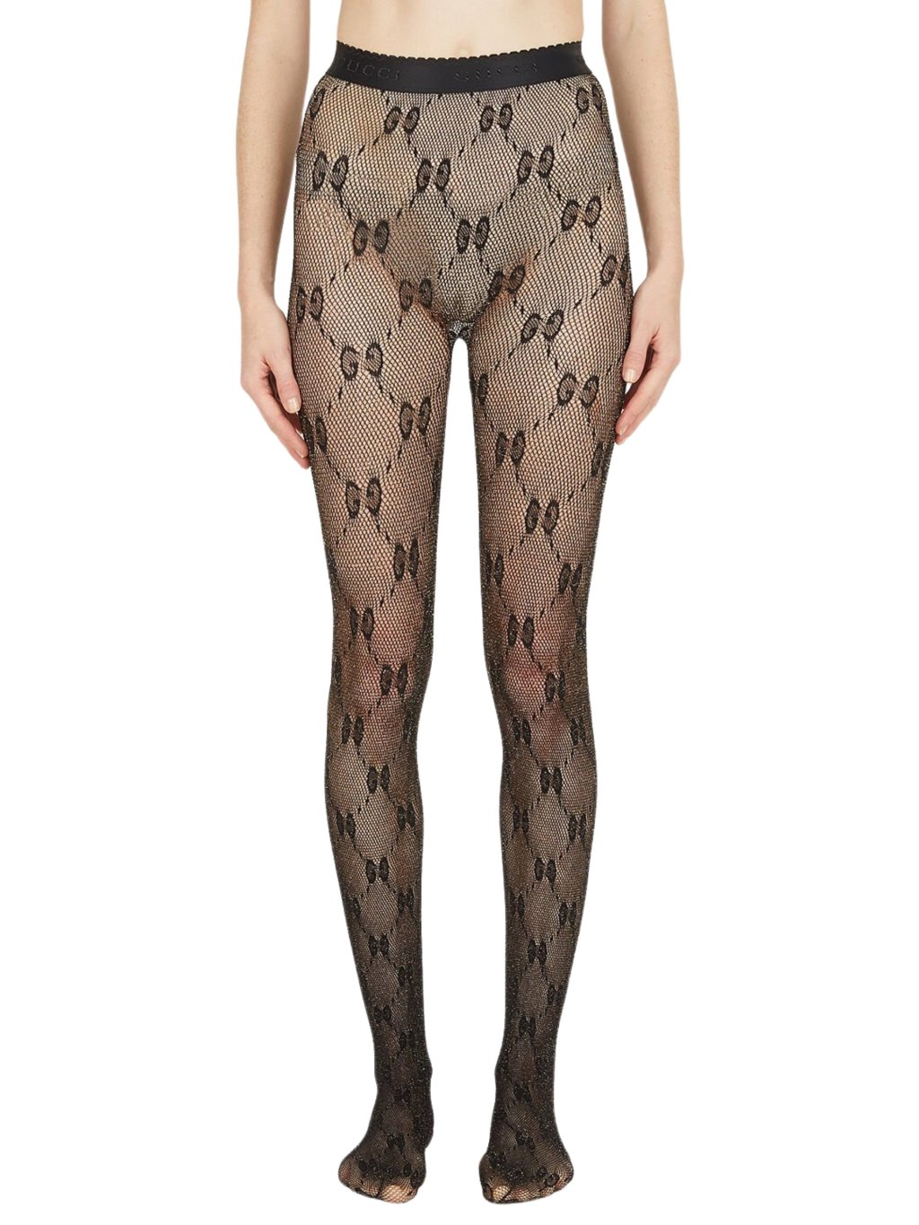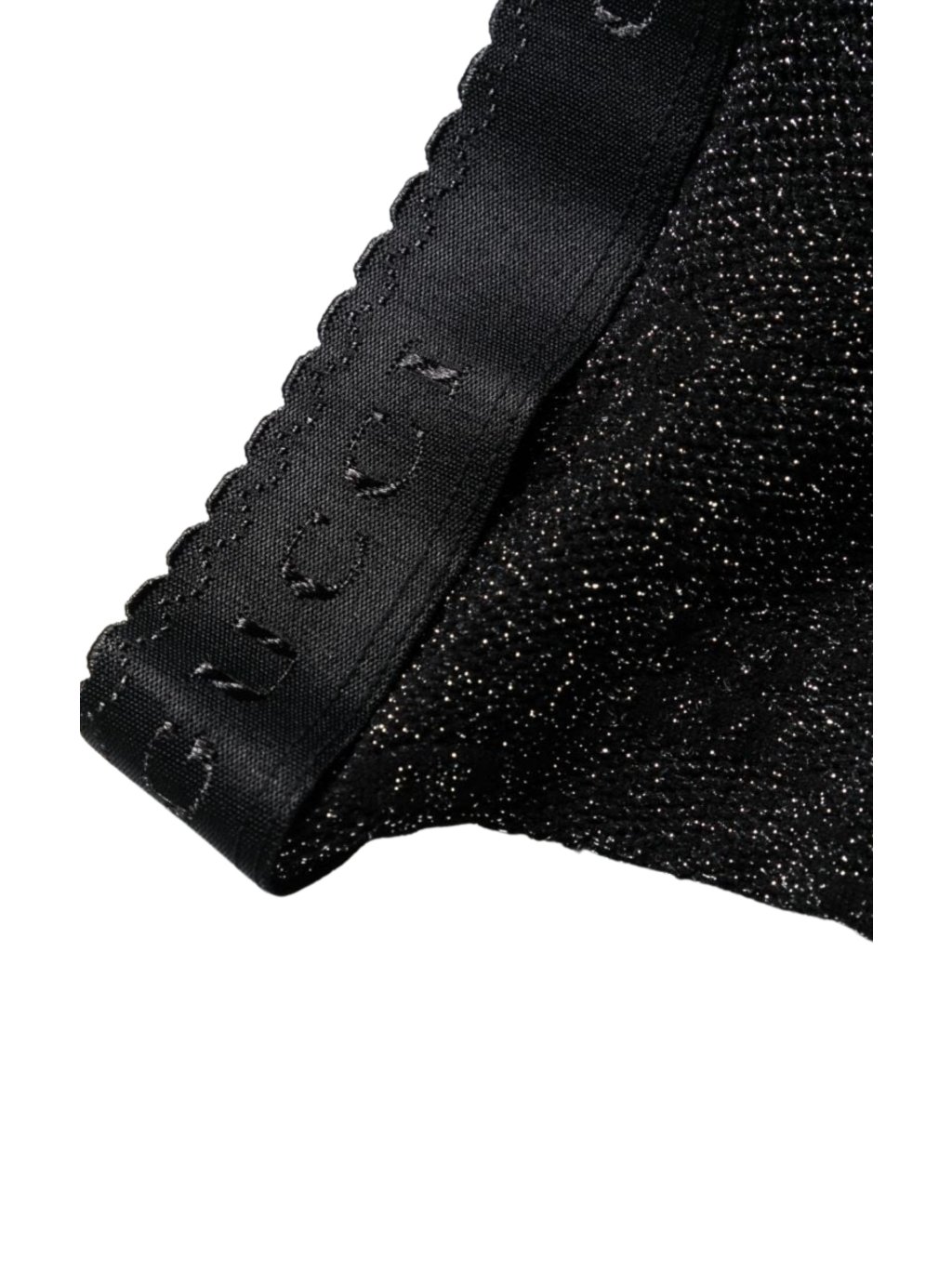 Čierno-zlatý elastický úplet GG Technická zmesová výroba v elastickej úpletovej väzbe Žakárové logo v páse Celoplošná výšivka GG 76 % polyamid, 13 % elastan, 11 % metalizované vlákno