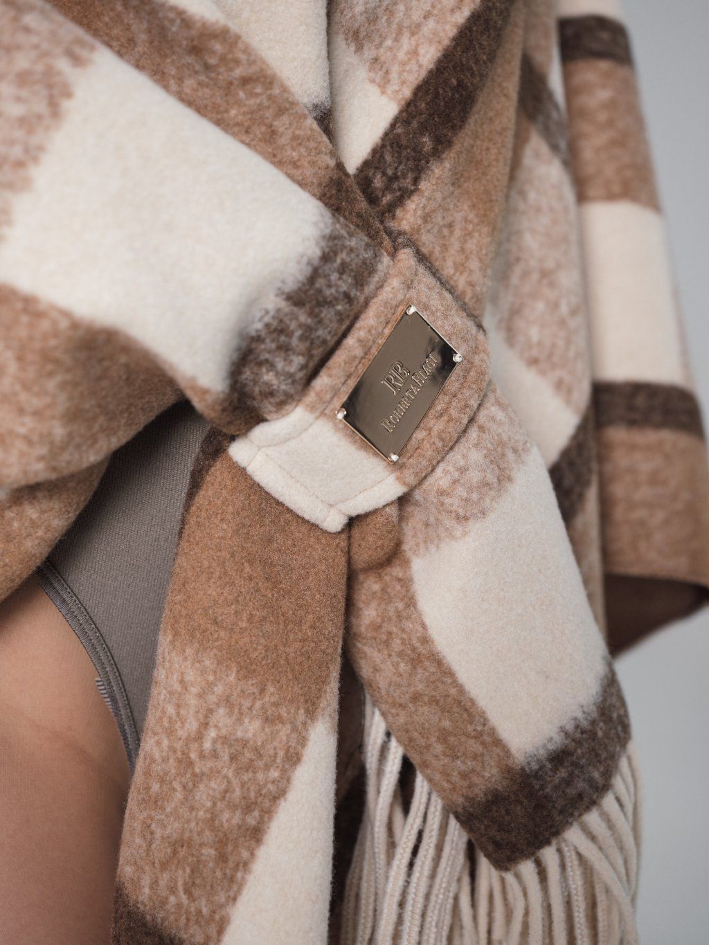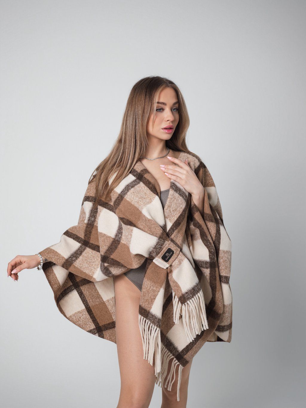 Elegantné pončo v nadčasovom károvanom vzore je ideálnym doplnkom na chladnejšie dni. Mäkký a príjemný materiál poskytuje maximálny komfort a pocit tepla, zatiaľ čo praktické zapínanie a jemné strapce dodávajú modelu štýlový, moderný vzhľad. Univerzálny strih umožňuje jednoduché vrstvenie a skvele doplní ležérne aj elegantné outfity. Perfektná voľba pre ženy, ktoré hľadajú spojenie pohodlia a štýlu.🤎